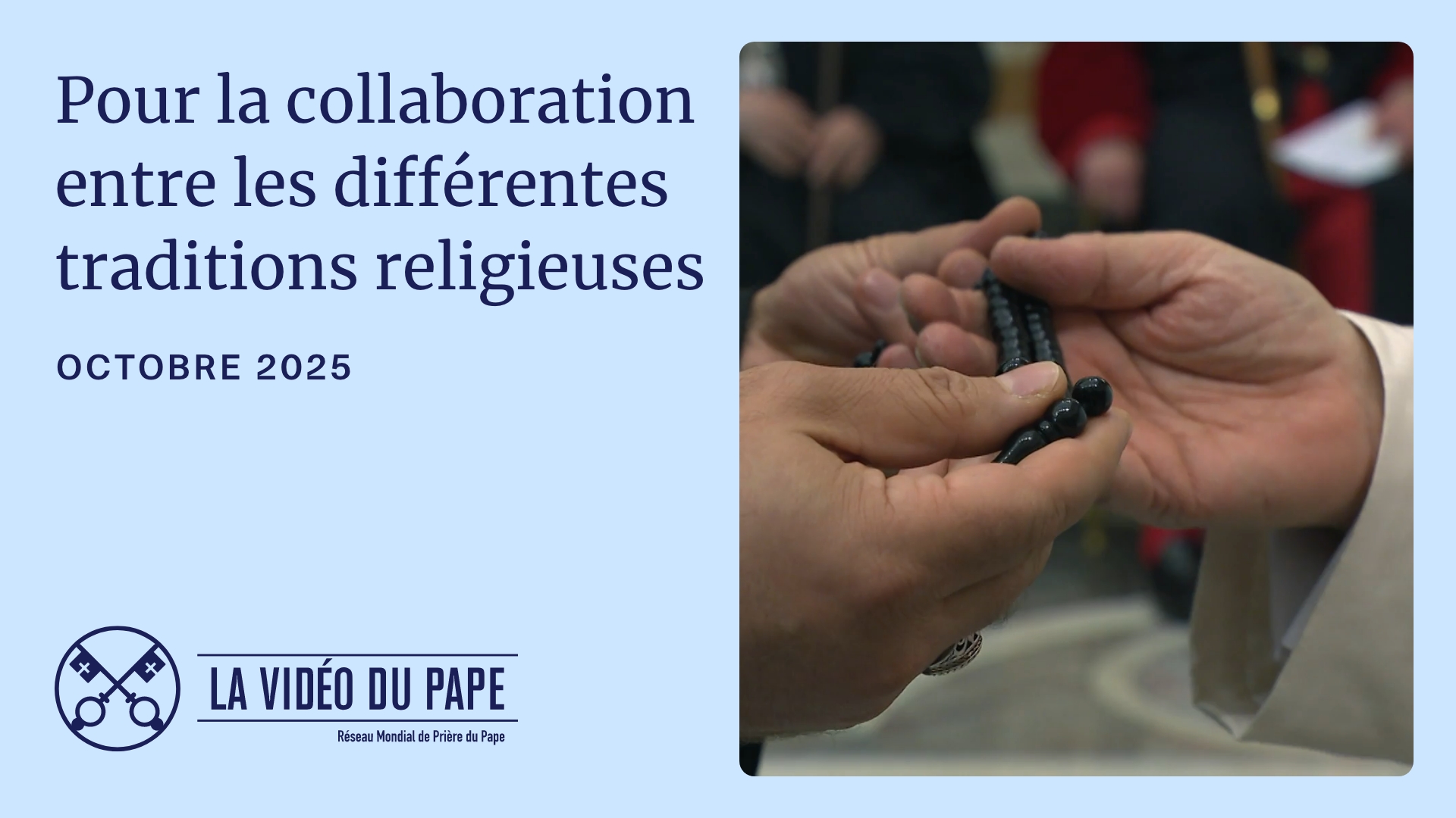 La Vidéo du Pape est une initiative officielle de portée mondiale qui a comme objectif la diffusion des intentions mensuelles de prière du Saint-Père. Elle est réalisée par le Réseau Mondial de Prière du Pape (Apostolat de la Prière). Depuis 2016, La Vidéo du Pape a enregistré plus de 253 millions de vues sur l’ensemble des réseaux sociaux du Vatican. Elle est traduite dans plus de 23 langues et a une couverture de presse dans 114 pays. Cette vidéo est produite et réalisée par l’équipe de La Vidéo du Pape du Réseau de Prière, coordonnée par Andrea Sarubbi, avec la collaboration de l’agence La Machi Communication for Good Causes et le soutien de Vatican Media. Pour plus d’information, consultez: La Vidéo du Pape.